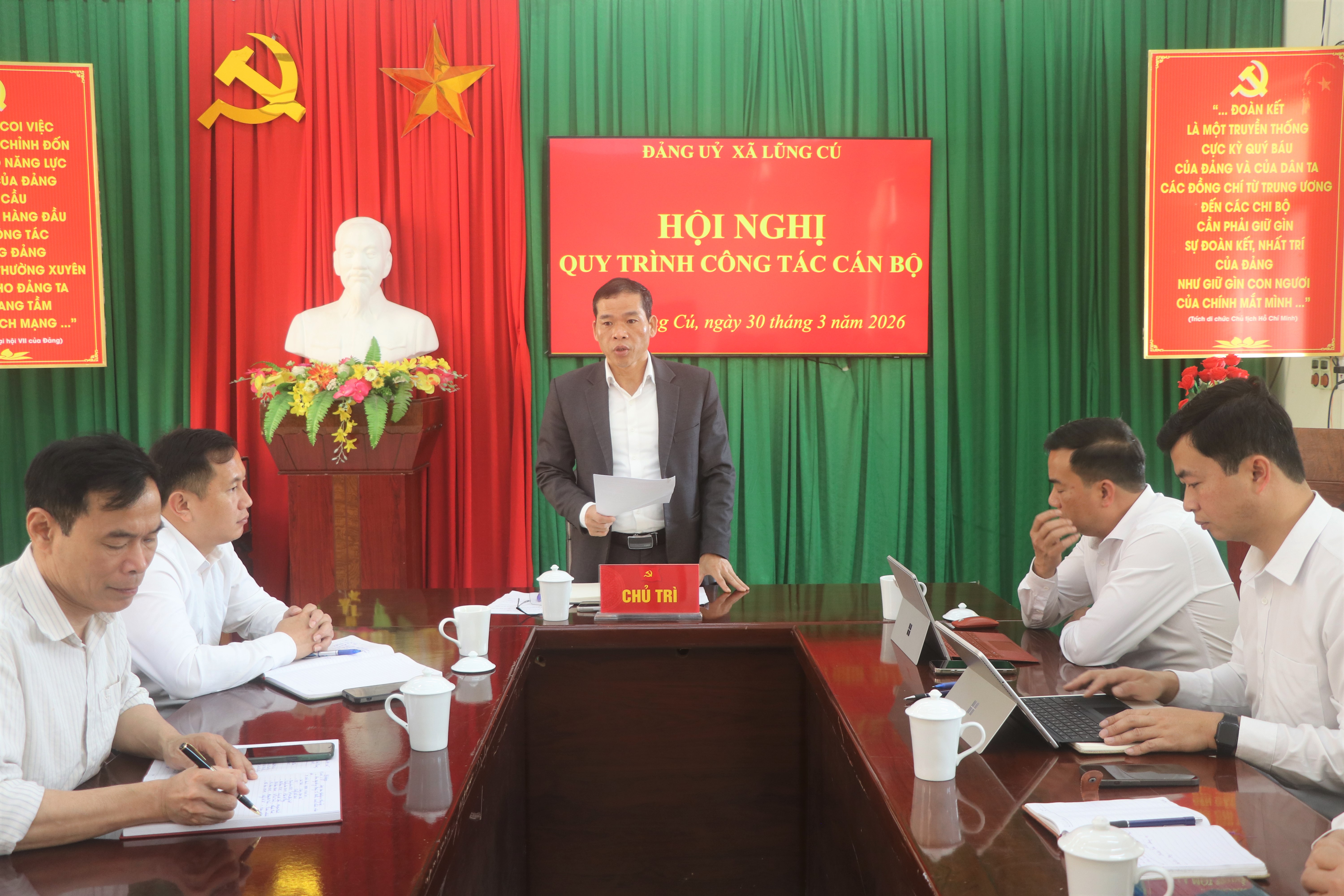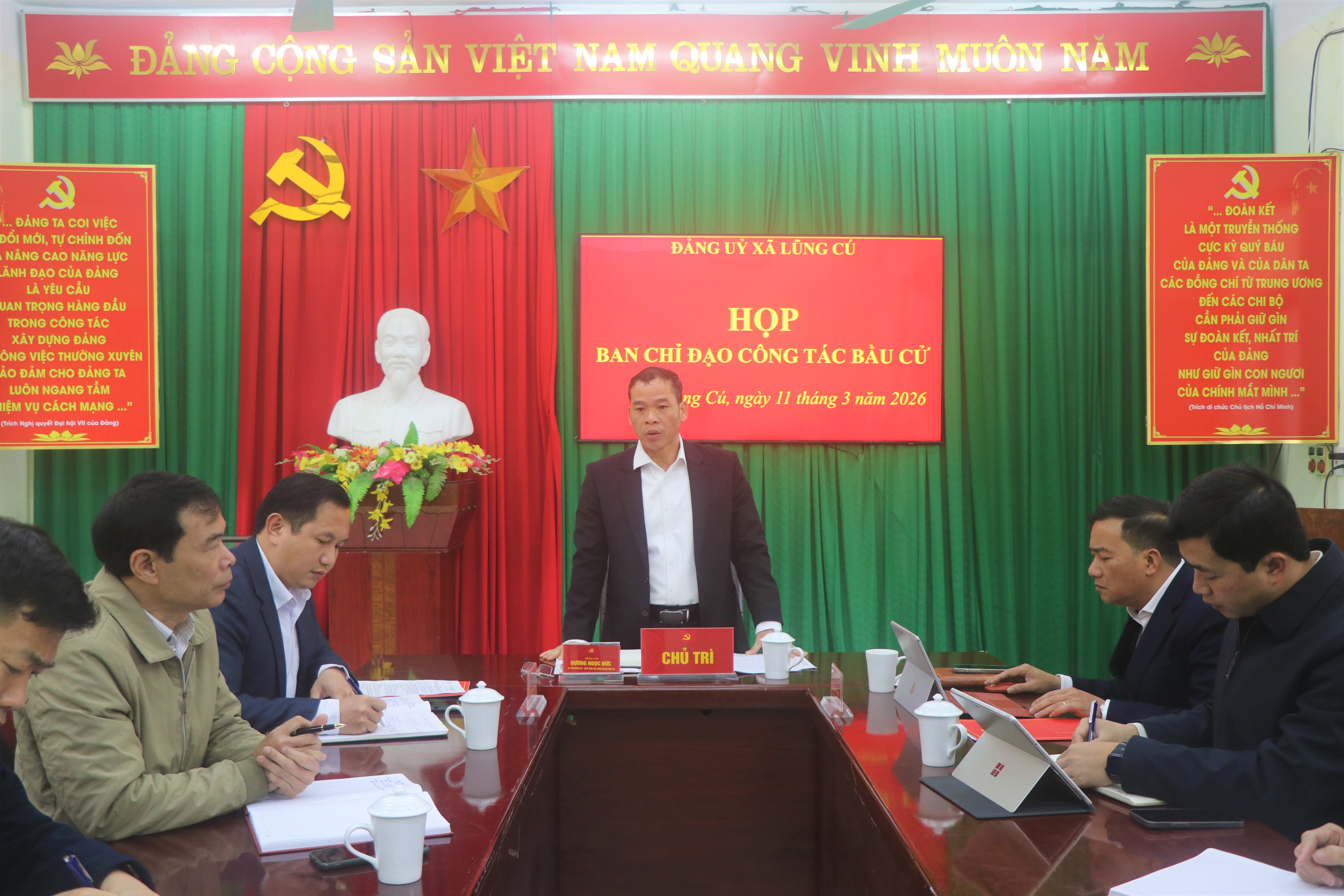 TTĐT - Sáng ngày 11/3, Đảng uỷ xã Lũng Cú đã tổ chức cuộc họp Ban Chỉ đạo công tác bầu cử nhằm rà soát, triển khai các nhiệm vụ trọng tâm phục vụ cuộc bầu cử đại biểu Quốc hội khóa XVI và đại biểu Hội đồng nhân dân các cấp nhiệm kỳ 2026 – 2031. Dự và chỉ đạo Hội nghị có đồng chí Dương Ngọc Đức – Bí thư Đảng uỷ, Chủ tịch HĐND xã, các đồng chí Thường trực Đảng uỷ, HĐND, UBND cùng lãnh đạo Đồn Biên phòng Lũng Cú, các đồng chí Tổ trưởng các Tổ bầu cử và lãnh đạo Văn phòng Đảng uỷ.