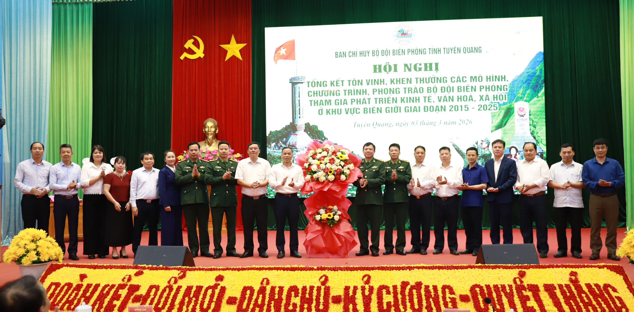 TTĐT - Chiều 03/3/2026, tại Hội trường Ban Chỉ huy Bộ đội Biên phòng tỉnh Tuyên Quang, đã diễn ra Hội nghị tổng kết, tôn vinh, khen thưởng các mô hình, chương trình, phong trào Bộ đội Biên phòng tham gia phát triển kinh tế, văn hóa, xã hội ở khu vực biên giới giai đoạn 2015 – 2025. Hội nghị nhằm đánh giá toàn diện kết quả 10 năm triển khai các chương trình phối hợp, mô hình giúp dân phát triển sản xuất, xóa đói giảm nghèo, xây dựng nông thôn mới, củng cố hệ thống chính trị cơ sở; đồng thời biểu dương các tập thể, cá nhân có thành tích tiêu biểu, góp phần giữ vững chủ quyền an ninh biên giới quốc gia, xây dựng khu vực biên giới ngày càng ổn định, phát triển.