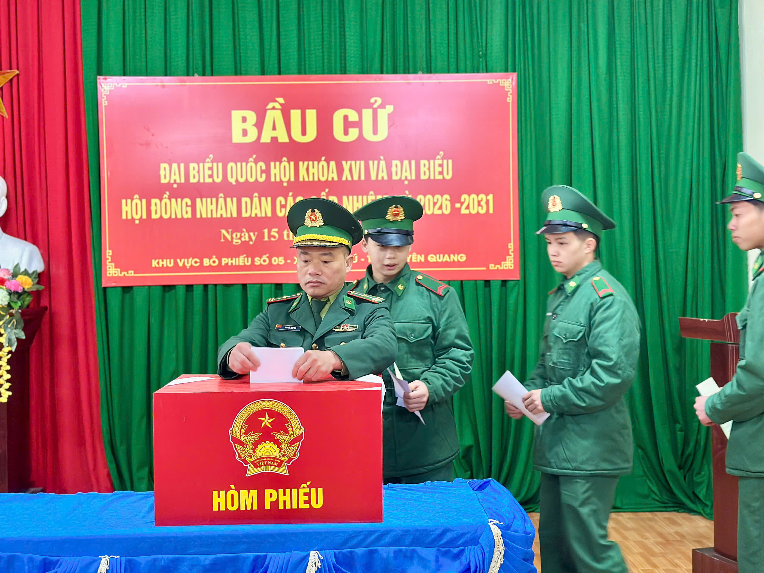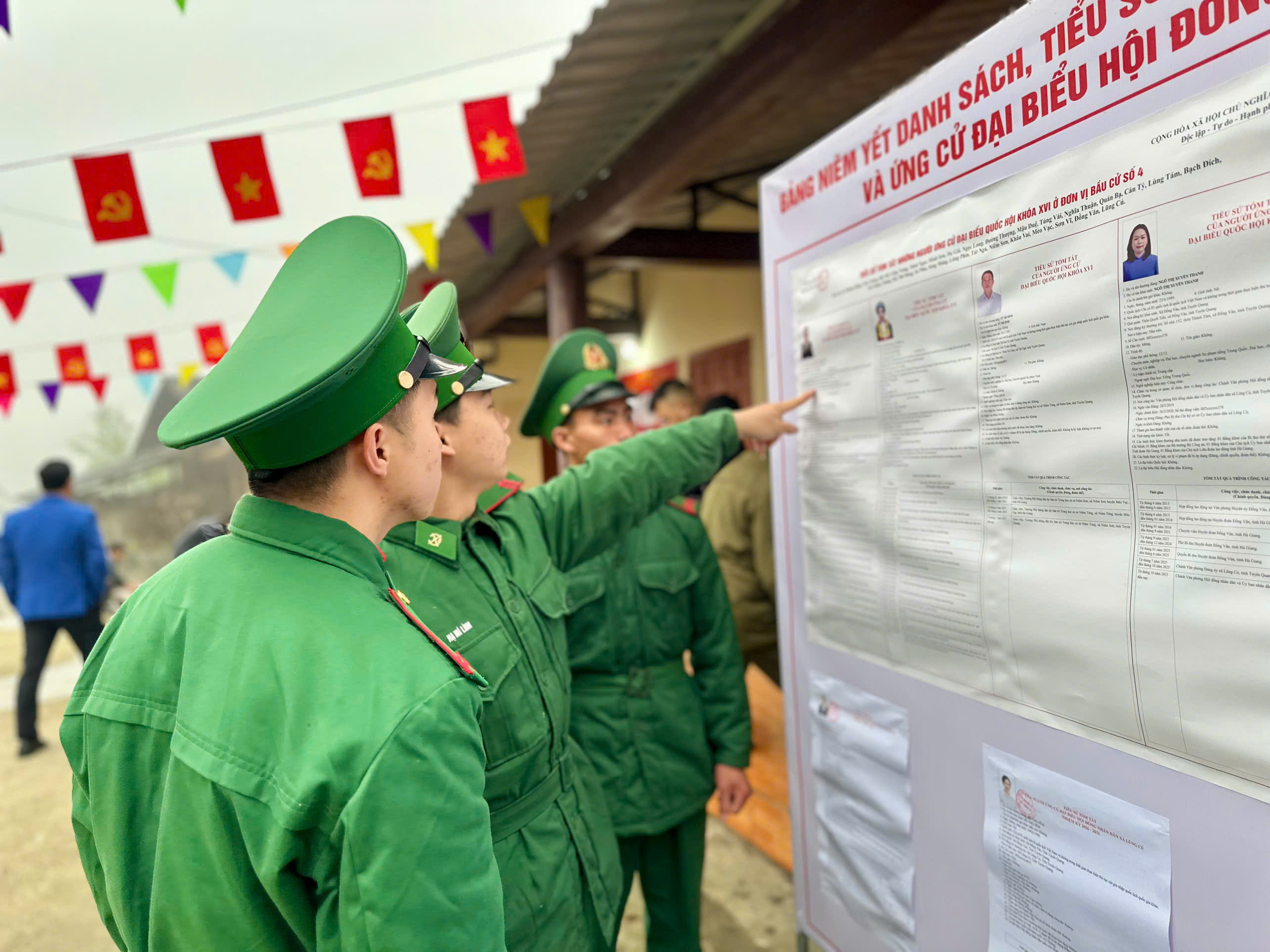 Cán bộ, chiến sĩ đồn Biên phòng xã Lũng Cú thực hiện quyền bầu cử tại khu vực bỏ phiếu trên địa bàn xã