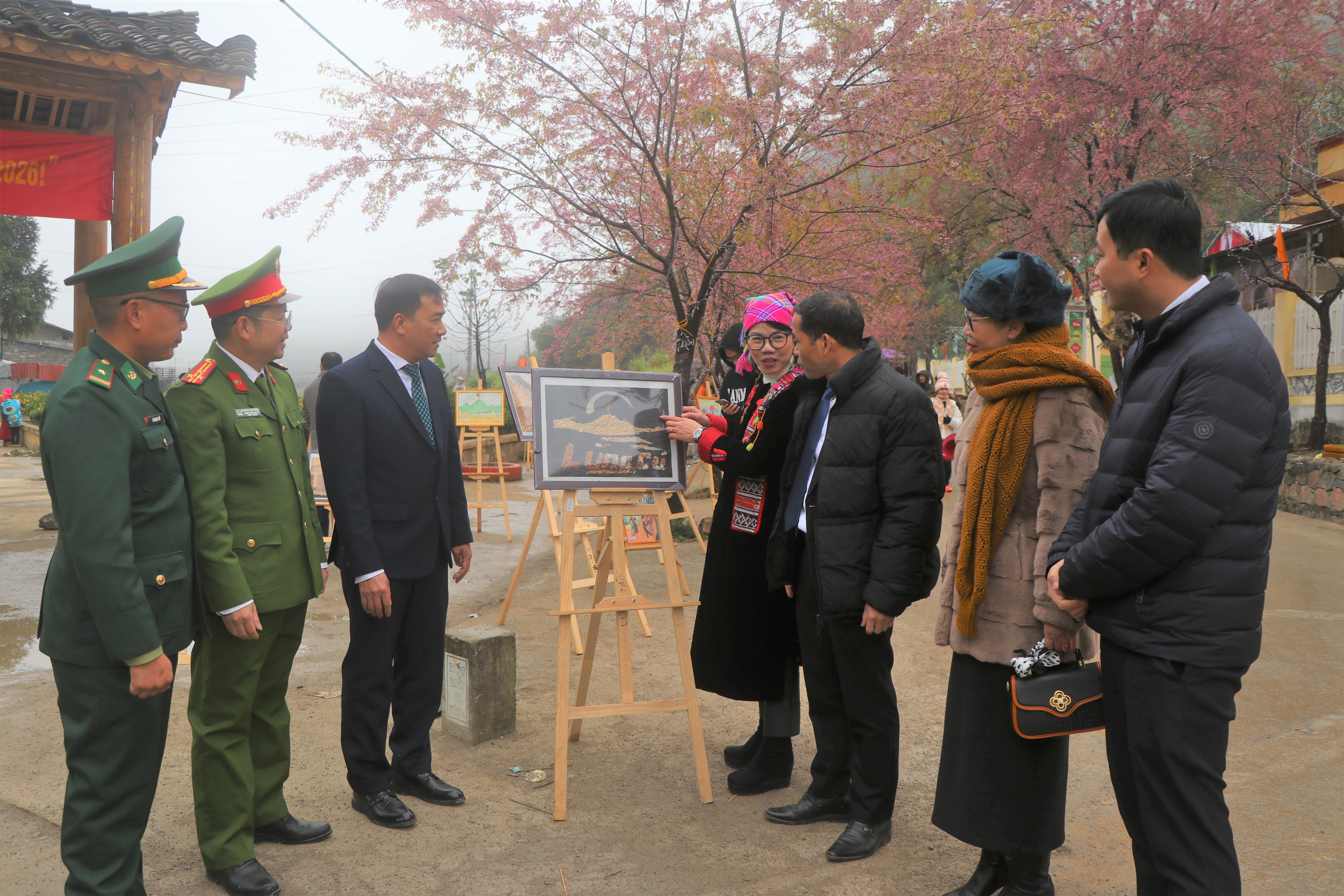Các đồng chí lãnh đạo thăm quan khu vực trưng bày tranh vẽ về xã Lũng Cú