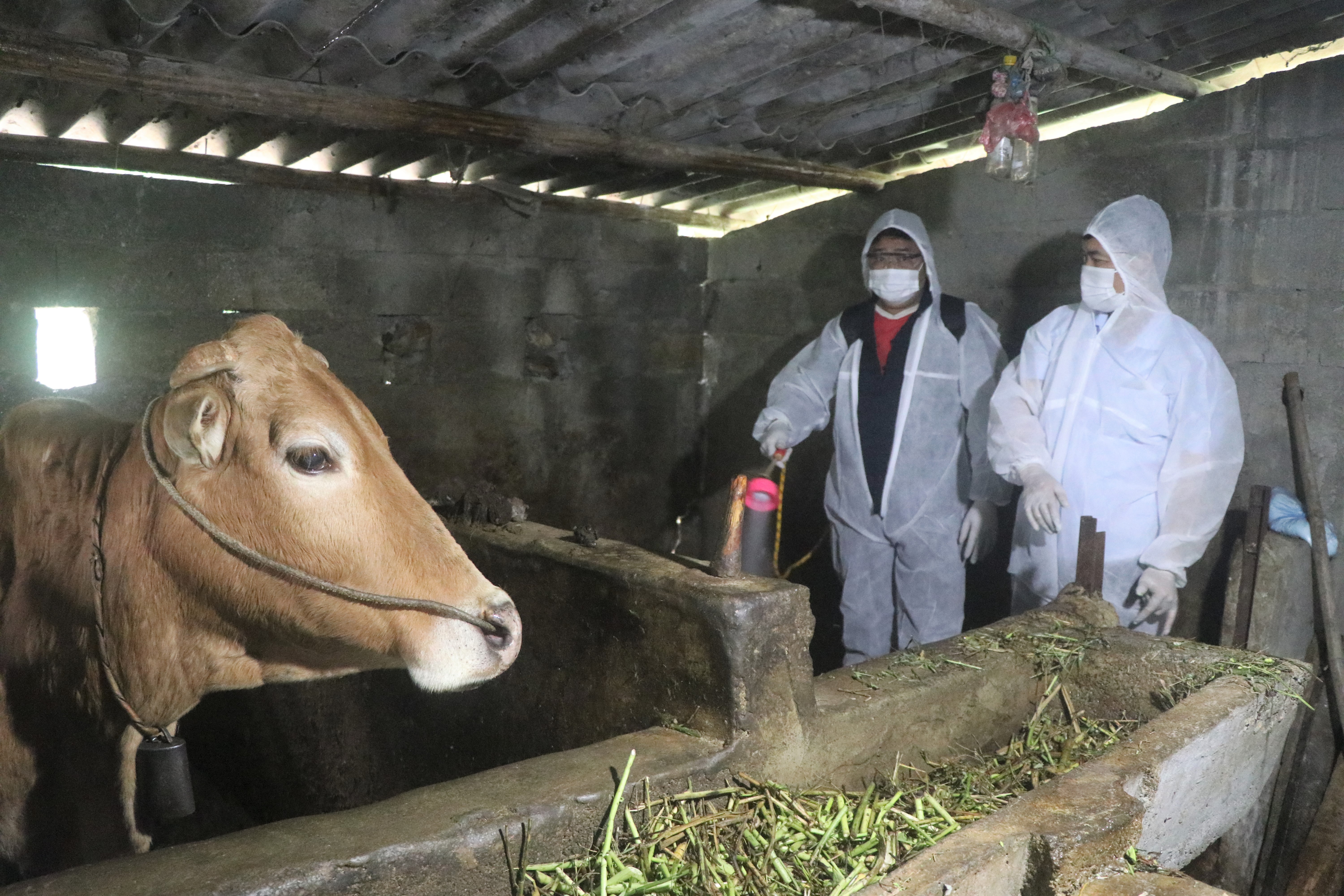 Thực hiện tiêu độc, khủ trùng tại chuồng trại của người dân thôn Hồng Ngài dảm bảo đúng kỹ thuật