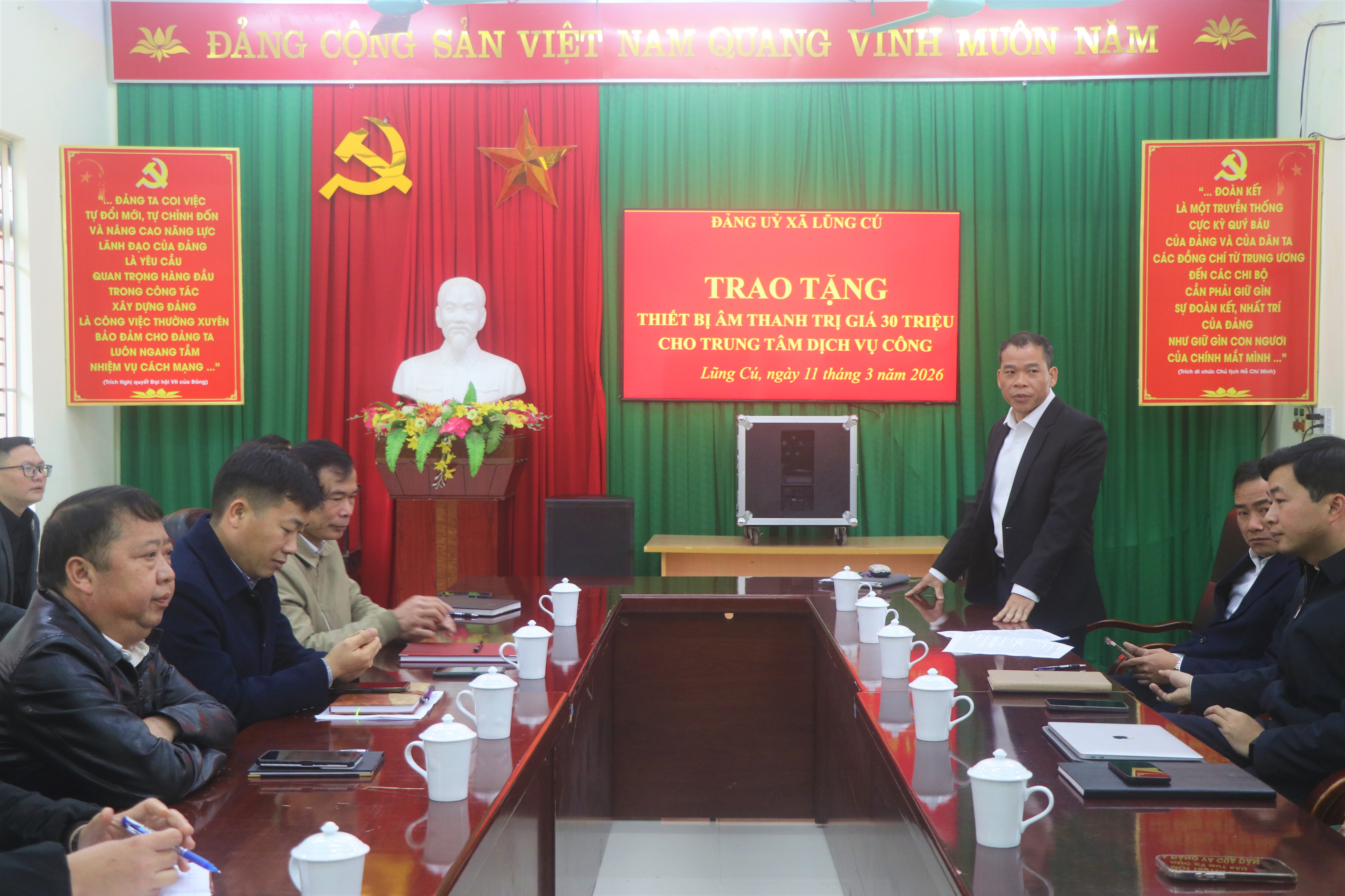 Các đồng chí lãnh đạo xã Lũng Cú trao tặng bộ thiết bị âm thanh cho Trung tâm Dịch vụ công xã Lũng Cú