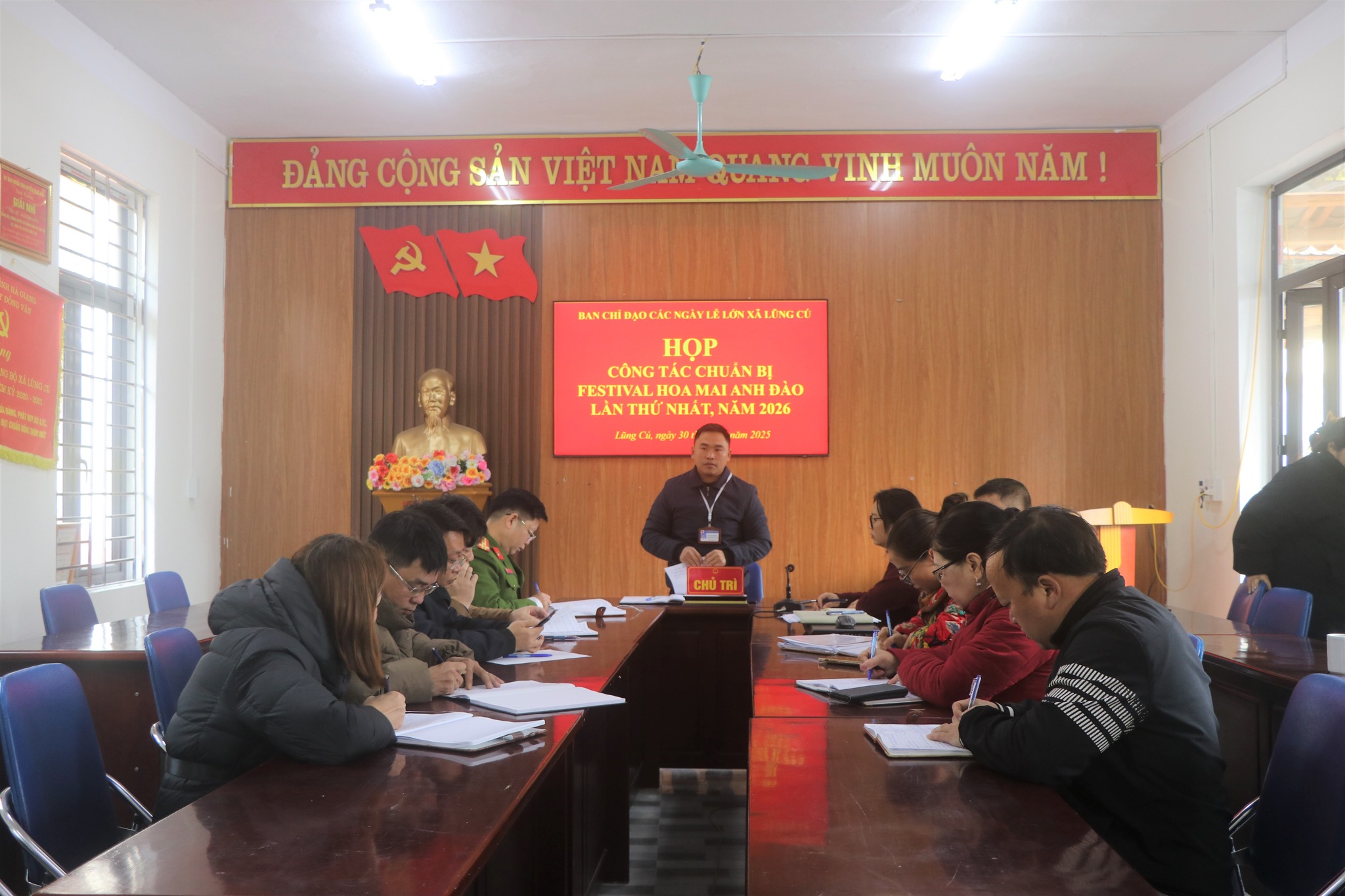 TTĐT - Hướng tới Festival Hoa Mai Anh Đào lần thứ I năm 2026, Sáng ngày 30/12, Ban Chỉ đạo các ngày lễ lớn xã Lũng Cú đã tổ chức họp triển khai công tác chuẩn bị với quyết tâm tạo dấu ấn ngay từ những bước đầu tiên. Cuộc họp nhằm rà soát tổng thể kế hoạch, phân công nhiệm vụ cụ thể và thống nhất các giải pháp tổ chức lễ hội đảm bảo trang trọng, an toàn, hiệu quả.